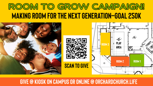 Our church has been exploding with the blessing of God in seeing young families and their children come to the Orchard. We are looking to raise 250k to expand our facilities and expand the Kingdom of God as we reach the next generation. Since we have the room for them and we just need the walls, let's make it happen for Jesus and the children!